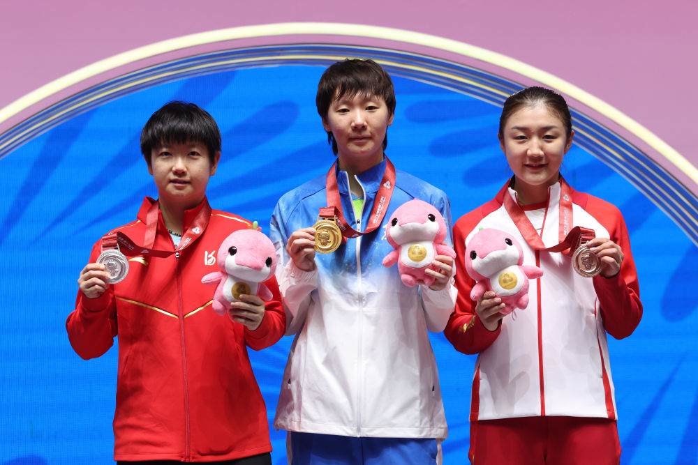 11月16日,冠军黑龙江队选手王曼昱(中)、亚军河北队选手孙颖莎(左)和季军山东队选手陈梦在颁奖仪式上合影。新华社记者 梁旭 摄