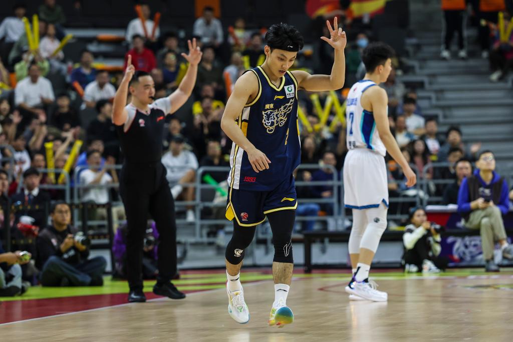 广东队球员徐杰(中)在比赛中投进三分球后庆祝。新华社发(郑家雄摄)