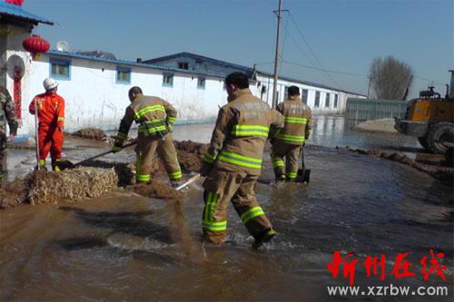消防官兵到达现场,经现场询问和侦察,了解到:由于该村外农田冬季浇水太多造成冰冻,近期气温回升使田地里冻结积水溶解,位于田地东北部一养牛场地势低洼,冰解融水全部灌入养牛场,情况十分危急,中队指挥员迅速与养牛场负责人联系村民铲车进行填堵,同时命令中队战斗员利用铁锹进行堵截,在经过大约20分钟的迅速抢救,最终排除险情,帮村民挽回了巨大的经济损失。最后在与养牛场负责人交接好手续确定无险情后,中队全体指战员收整器材返回中队,特勤中队官兵快速处置,不怕苦、不怕累的精神赢得了在场群众的一致好评。(张志远 白耀周)