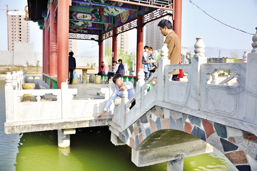 这个时候,宋利峰和女友刘丹,带着姐姐的孩子也恰好走进水榭。孩子们在兴趣方面往往会有惊人的趋同感,宋利峰的小外甥“眼馋”月月手里的鱼食,在韩建萍的开导下月月从袋子里抓了一把鱼食给了这个陌生的小伙伴。月月仍在水榭西侧的栏杆处向水面撒食,宋利峰的小外甥在石拱桥上模仿月月的动作,两个孩子之间的斜线距离不足一米。