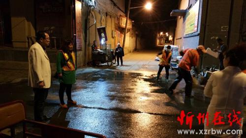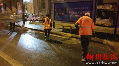 寂静的夜晚伴随着酒水车的轰鸣声一股股清澈的水流喷洒在马路上,街头沉现着一个个挥舞着扫帚的橙黄色身影,点缀的忻州城区的夜色更加靓丽。