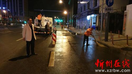 这是4月21日凌晨24时许,记者在新建北路长征路派出所门口街道偶遇的一幕;现场酒水车的轰鸣声和扫帚清扫马路发出的唰唰声交融在一齐,环卫工们挥汗如雨低头挥舞着扫帚清洗着马路,正在现场亲自指挥的忻州市环卫处处长石建新告诉记者:“冬季以来由于雨雪冰冻,近管环卫工每天清扫但垃圾凝聚在路牙旮旯里,开春了,为不影响市民的出行,我们利用晚上人们熟睡时段对街头所藏的污垢进行清洗,我们环卫处全员出动,从4月18日开始至五一节前结束,对全市所有马路进行一遍地毯式的全面清洗,要求勿见本色,以实际行动迎接五一国际劳动节。”举目远望扫帚过后沉现出了黑黝黝的柏油路面。