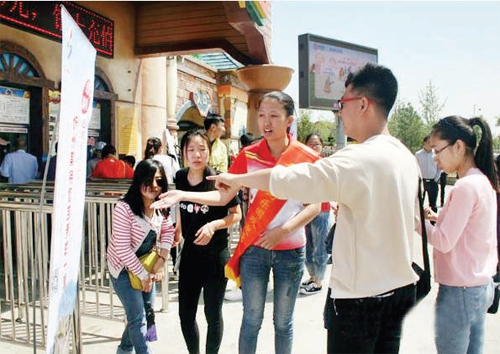 会后,工作人员在景区内张贴了忻州申办“2016年山西省旅游发展大会”投票海报,并为游客讲解活动内容及投票方法,倡导人人助力、人人投票。图为工作人员为游客讲解投票事宜(忻仁)