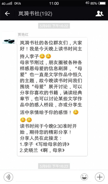“交流、集体读书,都是为了让大家重新找回读书的感觉,如果大家都读起书来,我们就达到基本的目的了。所以在读书这件事上,从形式到内容都不做太多要求。只要读起书来,参与进来就好,在读书会让大家感到的不是约束,而是心灵的放松。可以这么说,让读书回归到读书本身,就是生命成长和完善的需要。”田沁梅由衷地说。