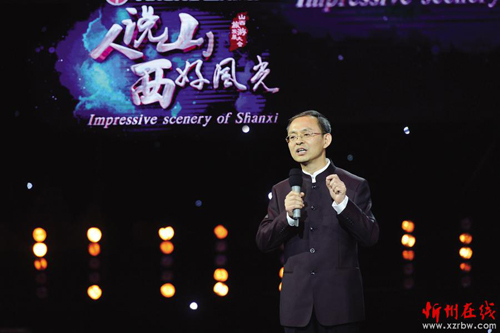忻州市长郑连生身穿庄严的中山装,借郭兰英老师《人说山西好风光》道出:人说山西好风光,左手一指太行山,右手一指是吕梁,在山西唯一一座横跨太行、吕梁两座山脉的就是忻州,着重介绍和诠释了一个真实的忻州。
