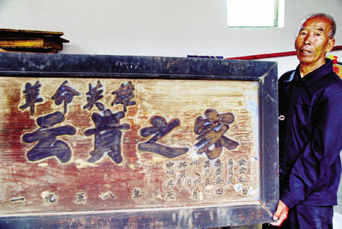 岳云贵的弟弟岳云明展示当年县政府授予的牌匾(潘德华 摄)