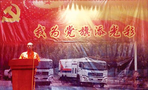 图为环卫工杜振宇正在演讲《我是一名光荣的环卫工人》