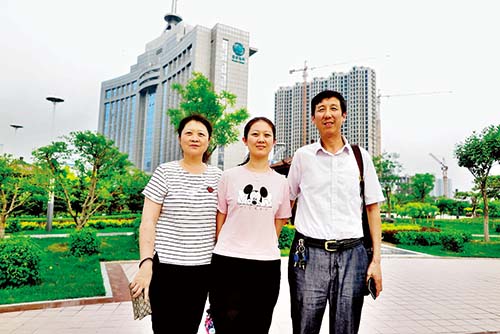 刘增芬、 吕勇、 吕卓蔚一家人在国家电网忻州供电公司办公大楼外