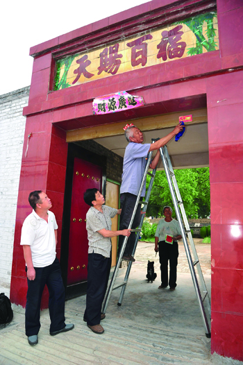 图为阳明堡镇东关村老党员贾治安亮出“共产党员户”标牌。