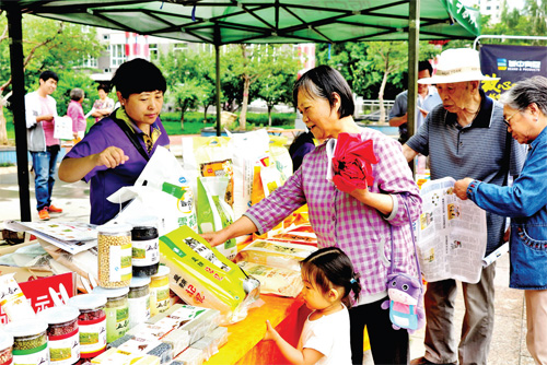 粮油配送中心工作人员在世纪花苑小区向居民展示健康食品