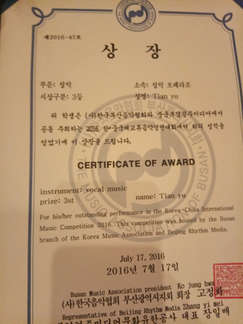 本次大赛获奖证书由釜山市长亲笔签发,韩国KBS、MBC等多家电视台全程直播了赛事。这是田雨继年初在香港国际声乐公开赛中获得二等奖后,又一次在国际声乐比赛中获得的大奖。(韩丽萍 蔡建伟)