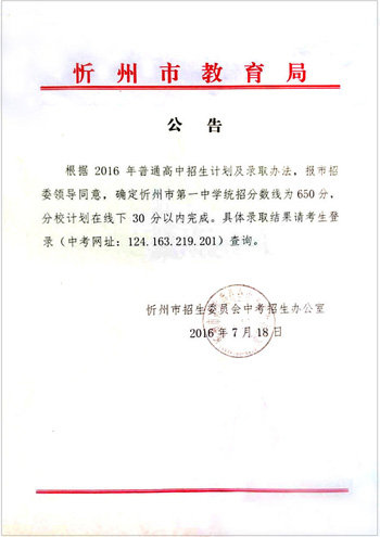 根据2016年普通高中招生计划及录取办法,报市招委领导同意,确定忻州市第一中学统招分数线为650分,分校计划在线下30分内完成。具体录取结果请考生登录(中考网址:124.163.219.201)查询。