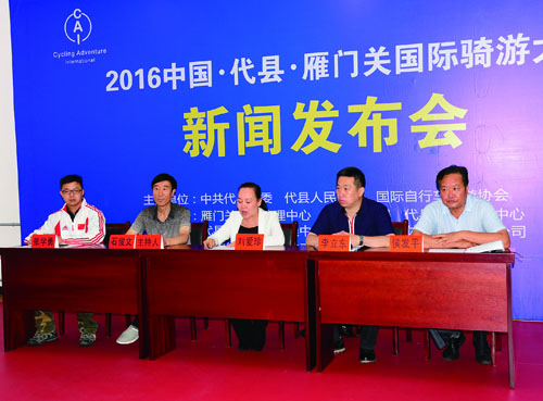 七月盛夏,古郡雁门,瓜果飘香,喜气盈门。以“骑游中华第一关,逐鹿千年古驿道”为主题的2016中国·代县·雁门关国际骑游大会定于7月29日至30日隆重举行,将云集来自全球20多个国家和地区的1000多名在国际、国内自行车赛事中初具影响力的职业、业余选手参加。标准之高,规模之大,盛况空前。为了给雁门关国际骑游大会宣传造势,营造浓厚氛围,大会组委会于7月20日下午在新城体育馆会议室举行2016中国·代县·雁门关国际骑游大会新闻发布会,特邀来自省市新闻媒体的20多位记者参加。出席新闻发布会的领导有政府副县长、大会组委会副主任刘爱珍,国家体育总局扶贫工作组组长、大会组委会副主任李立东,代县体育运动管理中心主任、大会组委会委员侯发平,深圳天珺体育咨询有限公司赛事总监张学勇。