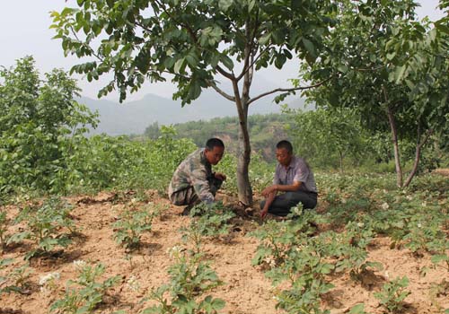 图为山药蛋地间作核桃树。