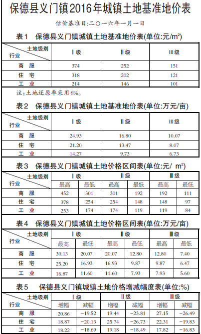 义门、桥头、杨家湾三镇基准地价更新工作已经市国土资源局组织有关人员检查验收,根据《忻州市国土资源局关于保德县桥头、义门、杨家湾三镇镇区土地定级与估价调整更新成果的批复》,经县政府研究决定,同意将义门、桥头、杨家湾三镇基准地价予以公布实施。