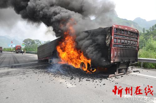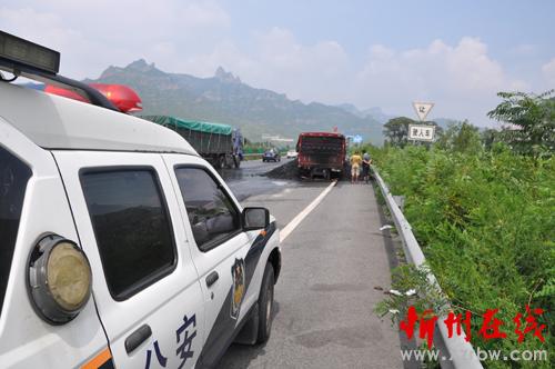 事故民警杜智升、史晋丽到达现场后,一辆苏牌照的半挂车停驶于最右侧车道,随着挂车尾部火势的越来越大,现场浓烟滚滚,火势正向主车方向移动,极有可能引起主车起火油箱爆炸,民警果断要求司机分离主车与挂车,消除着火的危险性。同时,秩序民警王泽恒在耿镇收费站分流前往五台山景区的车辆,等待救援。消防人员到现场后迅速将火扑灭。