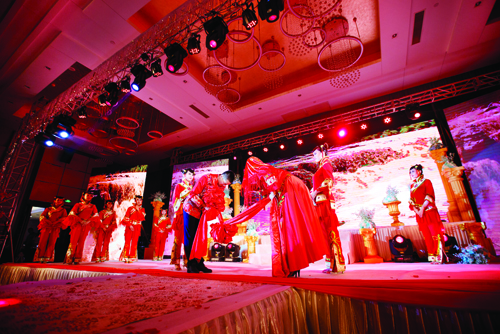 “秉父母之命,承媒妁之言,今日,新人喜结连理,诸宾共睹,天地同鉴,于此,新人三拜。一拜,感天地之造化,缘分天赐,德行地载。愿天地赐福,婚姻美满,天长地久。再拜,婚姻之意义,为延续生命,推进文明。上以继父母之血统,下以开万代之文化。三拜,今夕何夕,得此良人。愿此生忠贞不二,矢志不渝。”在滔滔黄河和大红灯笼的映衬之下,一对身着中式婚礼服的新人隆重登场。凤冠霞帔、红花礼帽,古朴而庄重,喜气又脱俗。民歌《想亲亲》道出了一对新人浪漫甜蜜的爱情故事,悠扬嘹亮的唢呐声吹响了幸福的号角,一对甜蜜的新人在亲朋好友的簇拥之下迈入洞房。中式婚礼秀《想亲亲》让现场的每一位观众感同身受,秀容大地的独特风俗文化在一场婚礼秀中体现得淋漓尽致。