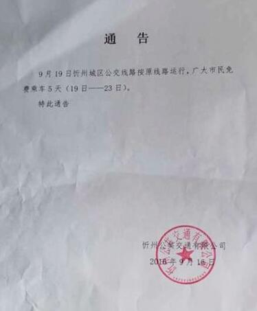 9月19日忻州城区公交线路按原线路运行,广大市民免费乘车5天(19日——23日)。