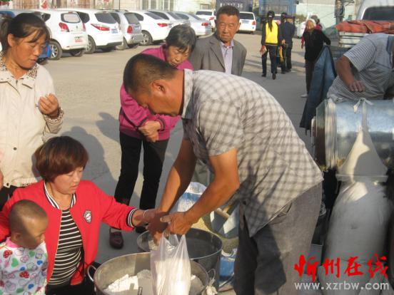 河曲县前川乡农民刘书恒创新创业意识强,今年5月率先创办流动杂粮加工“厂”。几个月来,他走村串乡,赶集赶会赶戏场,在群众眼皮下,现场加工莜面、豆面、荞面、糕面、高粱面、玉米面等,为群众提供无添加绿色放心杂粮面,很受欢迎。这一做法,也为自己开辟了增收门路,更为广大农民朋友树立了创新创业、勤劳致富的榜样。图为近日刘书恒在南园村戏场外的经营场面。(贾金理 摄)