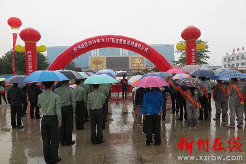 牢记历史惨痛教训,时刻不忘警钟长鸣。9月18日上午10点整,随着我市防空警报试鸣指挥部指挥长、副市长武宪堂一声令下,忻州城区18个防空警报网点的警报器同时发出响彻天地的嘶鸣。市政府、忻州军分区、市人防办有关领导和市人防工作领导组成员单位人员及社会各界群众冒雨在忻州城区体育广场参加了我市“2016年‘9.18’防空警报试鸣启动仪式”。警报试鸣活动在全市各县(市)城区同时举行。
