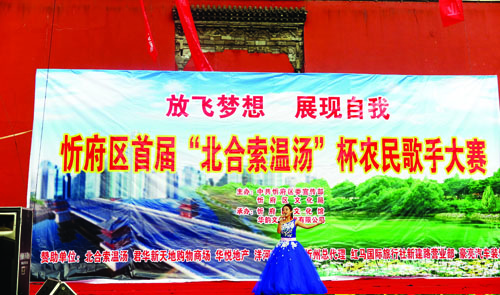 本报讯 10月26日,忻府区首届“北合索温汤杯”农民歌手大赛决赛在城门楼广场举行。28位来自忻府区各个乡镇的农民歌手同台献艺,一展歌喉。经过激烈地角逐,来自高城乡的选手班艺浩以一曲《故乡有话告诉你》脱颖而出,以9.6分的成绩获得了一等奖,并赢得了港澳双飞六日游的大奖。