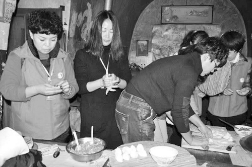 志愿者给孤寡老人包饺子。