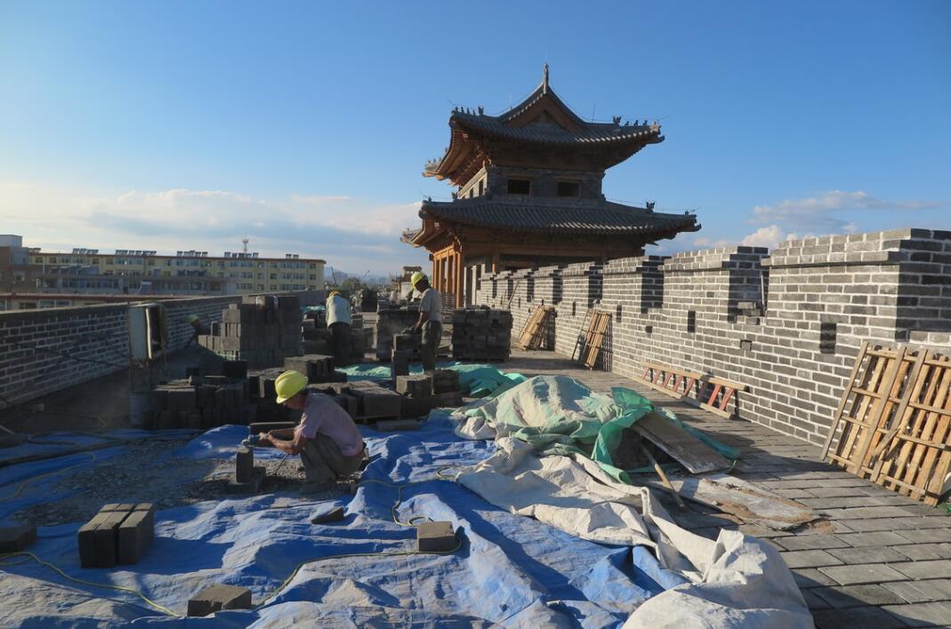 图为忻州古城南城门楼西侧堞楼施工现场。