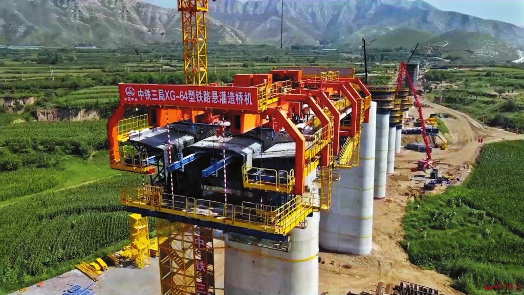雄忻高铁同河特大桥跨同河连续梁全长208米,最大跨度64米,主墩墩高28.5米至30米,为保证施工安全高效推进,XG-64型上承式结构悬灌造桥机首次在雄忻高铁山西段投入使用。施工期间,施工现场的信息化中心通过大数据、5G等技术,可实现造桥机行走、模板调节、线型监控、喷淋养护自动化和结构受力的可视化,做到施工过程实时监控、精准控制、及时预警。