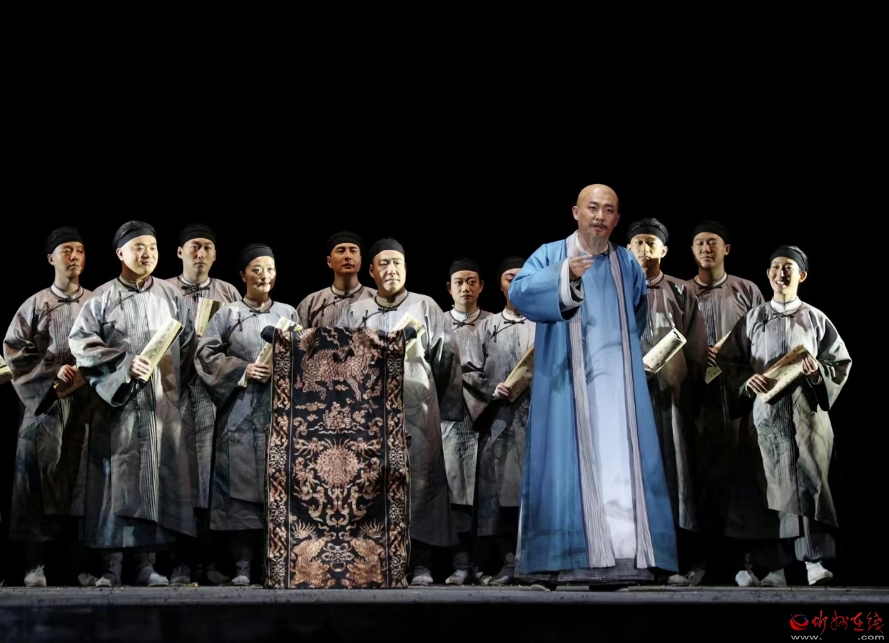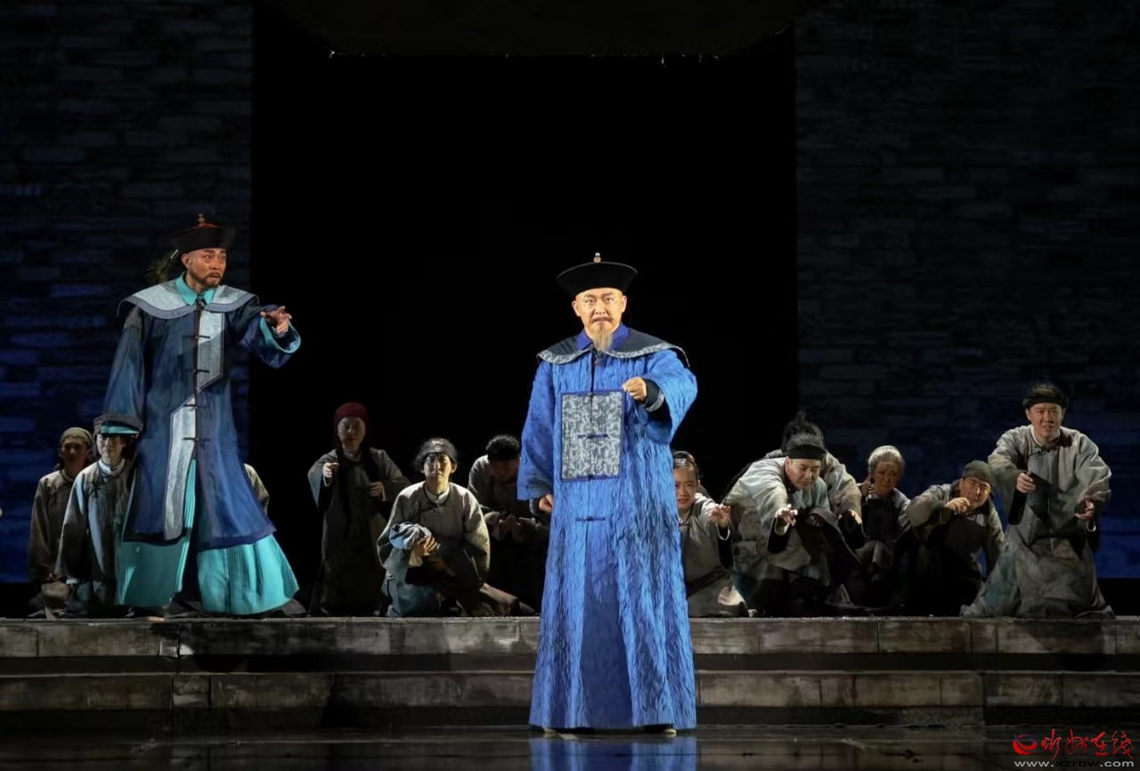 宏大震撼的舞美效果与细腻精湛的表演丝丝入扣,让现场观众全身心沉浸其中。剧中大名知县赵履谦的阿谀奉承、布政使奇英的阴险狡诈、官场裙带的缠缠绕绕、小舅子邢家良的不谙世事,为法情交织的爱恨情仇埋下了深深的伏笔。