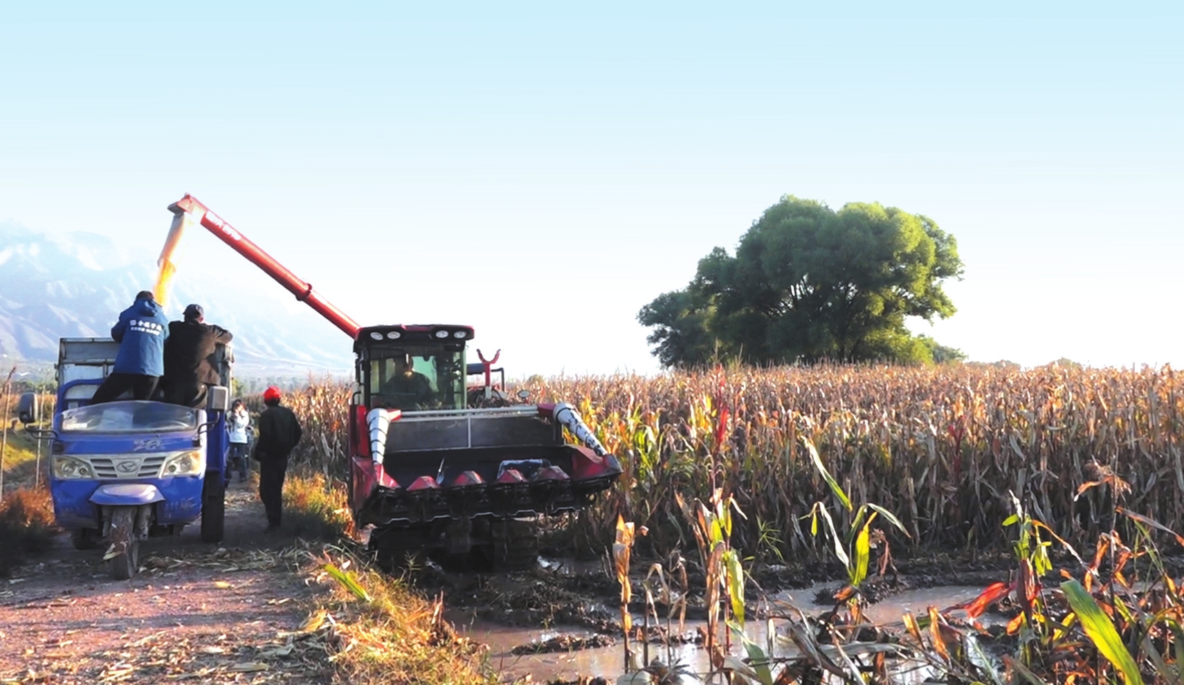 连日来,定襄县抢抓秋雨间歇期,组织大型农机具下地抢收,全力守护秋粮颗粒归仓。图为收割机在泥泞的玉米地里穿梭作业。张玉虎摄