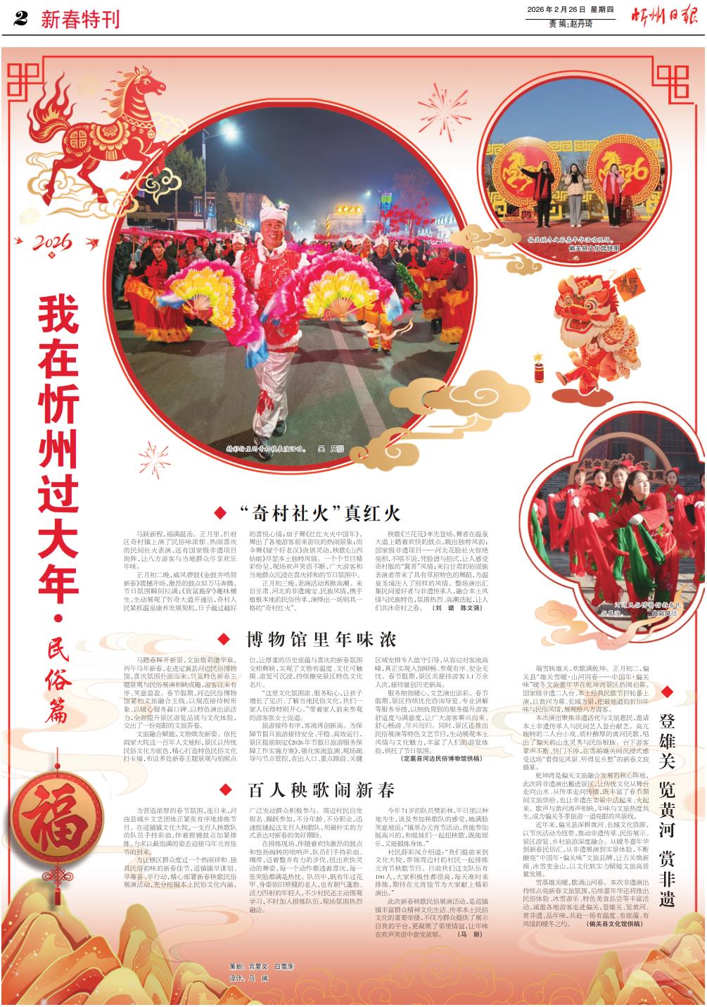 马踏春晖开新景,文旅焕彩谱华章。丙午马年新春,走进定襄县河边民俗博物馆,喜庆氛围扑面而来,只见特色新春主题景观与民俗展演相映成趣,游客往来有序、笑意盈盈。春节假期,河边民俗博物馆紧扣文旅融合主线,以规范接待树形象、以暖心服务赢口碑、以特色演出添活力,全面提升景区游览品质与文化体验,交出了一份亮眼的文旅答卷。