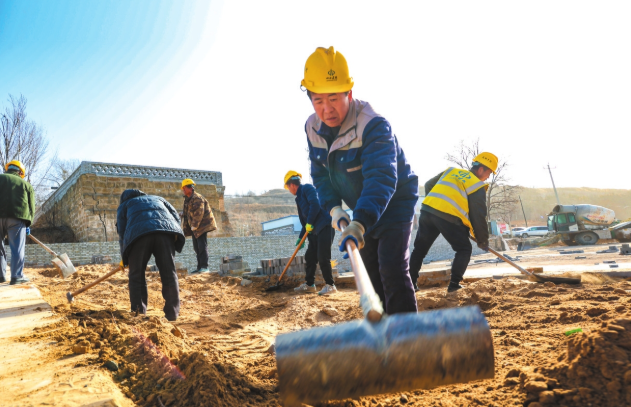阳面村的工人正在铺设乡村驿站广场的地面。