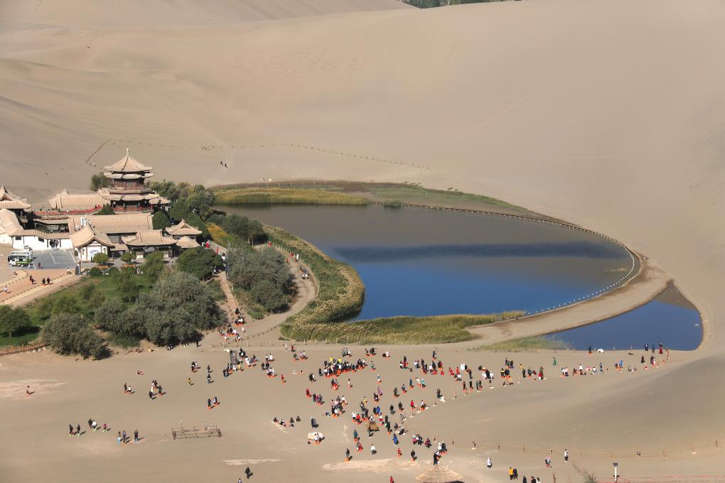 2024年10月4日,游客在甘肃省敦煌市鸣沙山月牙泉景区游览。张晓亮 摄