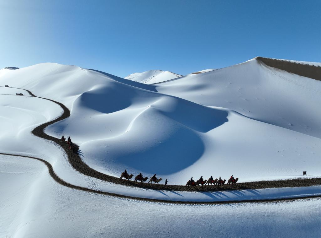 2023年11月15日拍摄的甘肃省敦煌市鸣沙山月牙泉景区雪景。张晓亮 摄