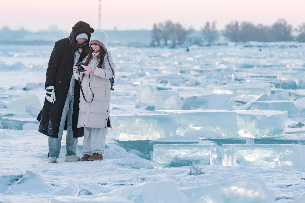 1月7日,在封冻的松花江哈尔滨段,游客在“钻石海”游玩。新华社记者谢剑飞摄