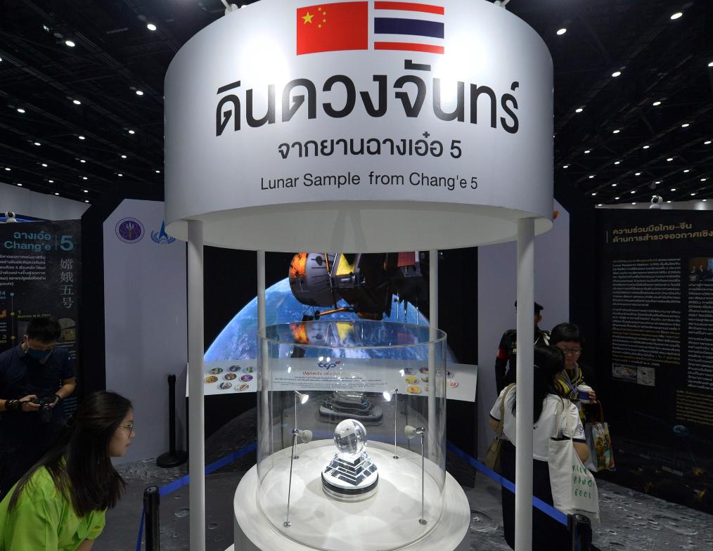 这是2024年7月23日在泰国曼谷举行的“2024泰国未来科学力量展览会”上拍摄的嫦娥五号月壤样品展台。新华社发(拉亨 摄)