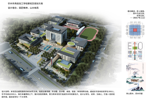 我们本着国匠精神-九宫格布局、山水格局-背山面水、四水归堂的设计理念,团结上学、振兴技校的精神,努力将本项目打造成为忻州市的新名片,圆技校学生一个大学梦。我们注重整体空间的舒适性、艺术性,不强调过分统一。设计中注重细节处理和学生们行为模式的考虑;将环境气氛和设施布置的更具有灵活性、亲和力,适应宽松、生活化的教学模式。
