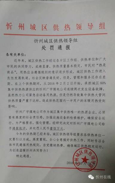忻州城区供热领导组处罚通报