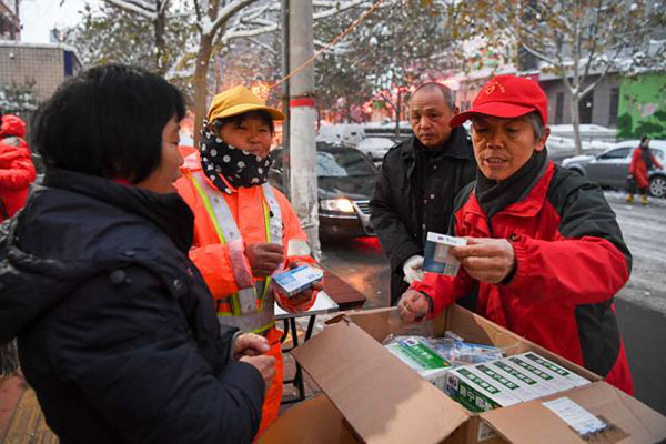 图说:蒋爱荣(右一)为环卫工人分发爱心人士捐赠的感冒药(11月23日摄)。图片来源:新华社