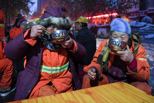 百度贴吧网友“马克斯基”说:“下雪天路过郑州广电南路爱心粥屋,寒风中200多位环卫工人围坐在一起喝着热腾腾的粥,有说有笑,我流泪了。此刻,爱心粥屋就是我们‘城市美容师’的家。”