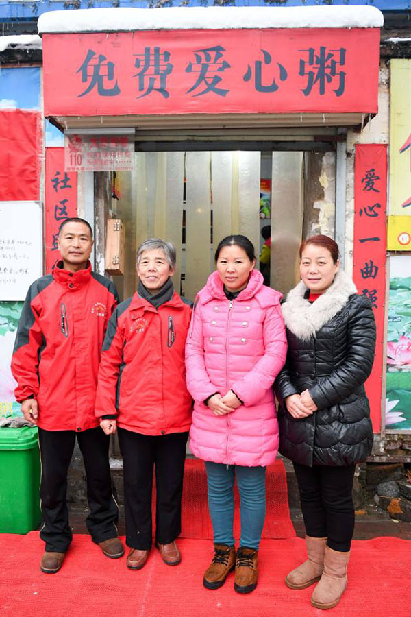 图说:蒋爱荣(左二)与志愿者们在爱心粥屋前合影(11月23日摄)。图片来源:新华社