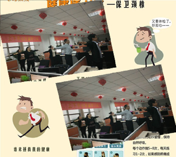 开门红战役打响,全员全身心投入,同时对职场内员工的身体健康尤其是颈椎健康更是极大挑战。中支综管部门及时提醒办公室内的上班族,应该保护颈椎健康,提示半小时后应该起身活动一下,用头写“米”字,并适时组织员工停下手中的工作,打开电视机,集中做好工间劲椎操。保护颈椎,保护自己,服务公司,以充沛的体能服务开门红战役。