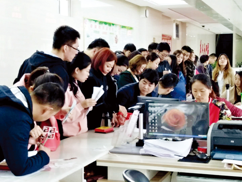 图为现场扎堆领证的准新人 张林泉 摄影报道