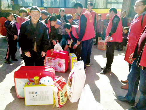 深秋的早晨伴着凉风,空气中带着丝丝冷意,志愿者们乘坐的中巴车缓缓地驶入芦草沟村。中巴车还没停稳,在村口晒太阳的村民就都围了过来。当村民们得知志愿者的来意后,非常感谢志愿者的爱心帮助。此时大家一鼓作气将车上带来的慰问品搬了下来,分类后开始分发。本次活动主要探望的是该村的13户孤寡老人,慰问物品包括每人一桶油、一袋面、一袋米以及食盐、酱油、醋等生活必需品。志愿者还为当地的儿童准备了新书包以及防寒过冬的衣服。经过一个小时的忙碌,慰问品分发完毕。
