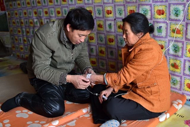 贺星龙(左)在为山西省临汾市大宁县徐家垛乡曹家坡村的一位村民看病。新华社记者曹阳摄