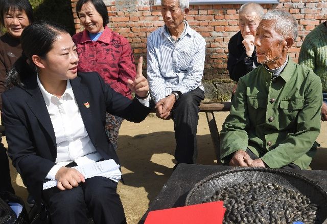 安徽省金寨县花石乡大湾村扶贫工作队副队长余静(前左)在金寨县大湾村与村民交流。新华社发