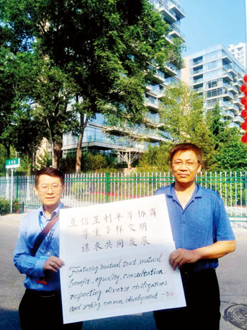 作品由两件组成,均由宣纸装裱,尺幅90×60,内容体现的是“上海精神”。一件由一尔分作三行,用毛笔大楷书写,内容是“互信互利平等协商,尊重多样文明,谋求共同发展”,另一件为对应的意译毛笔英语,分四行完成。