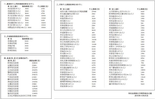 自2018年12月10日市委、市政府办公厅发出《关于开展“送温暖、献爱心”社会捐助活动的通知》(忻办字【2018】86号)以来,市四大班子领导率先垂范,各县(市、区)、各单位高度重视,紧急部署,广大干部职工积极响应,踊跃捐款,又一次掀起了“送温暖、献爱心”社会捐助活动的高潮。截至2019年4月25日下午4时,全市累计接收捐款2802113元,其中市直79个单位组织参加了此次捐助活动,共计捐款585095元;各县(市、区)接收捐款2217018元,为解决我市困难群众的生产、生活问题,助推脱贫攻坚起到了积极的作用。现将活动进展情况公告如下(市直单位以捐助时间先后为序):