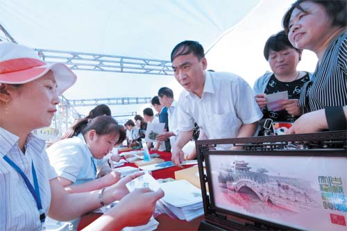 5 月19 日,集邮爱好者在河北省邯郸市永年区广府古城购买《中国古镇(三)》特种邮票。新华社发(郝群英摄)