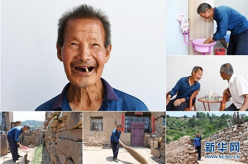 魏连保,男,1949年出生,山西省长治市沁源县支角村人。独居的他生活不便,2017年年底,村委会为魏连保在内的8位老人修建了一排整齐的新居,并统一安排就餐。 左上:魏连保肖像;右上:魏连保在新居洗脸;右中:魏连保(左)在新居和邻居李秀成聊天;下右:魏连保在旧居前留影;下中:魏连保在旧居打扫院子;下左:魏连保在旧居为蔬菜浇水(拼版照片,6月18日摄)。 地处晋东南的山西省长治市,位于由太行山、太岳山环绕而成的上党盆地中。在群山中、崖壁上,许多村庄自然条件恶劣,基础设施落后,脱贫致富是大山深处人们的迫切心愿。 近年来,一场场脱贫攻坚战,在一个个深山村打响。政府全力探索脱贫路径的同时,山区百姓因地制宜,靠自己的双手和智慧走上致富路,交出了一份扎实的脱贫答卷。 记者在太行山、太岳山一路寻访,记录下多位70岁老人的生活。这些共和国的同龄人,亲历了山乡的巨变,见证着长治山区脱贫攻坚伟大工程的一步步推进。 新华社记者 杨晨光 摄